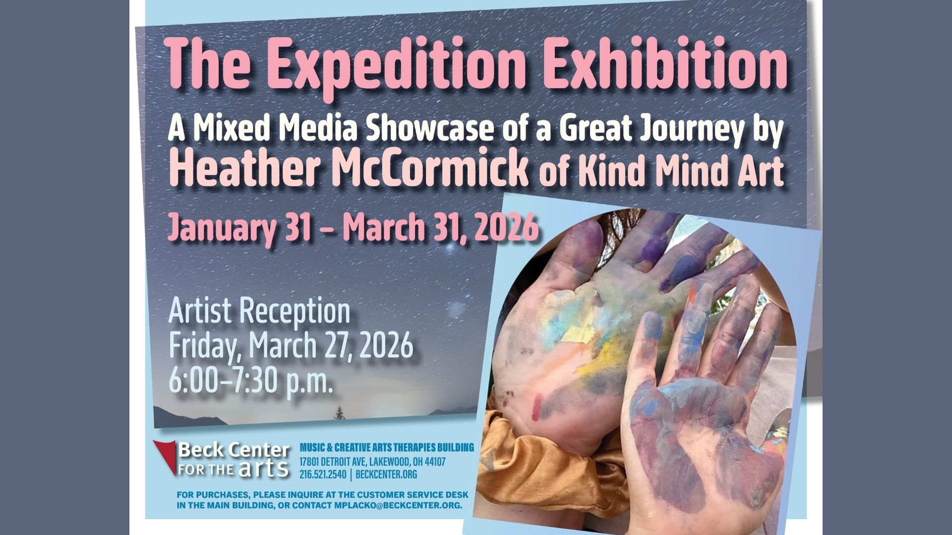 Expedition Exhibition: A Mixed Media Showcase of A Great Journey by Heather McCormick will be on view January 31–March 31, 2026 in Beck Center’s Music and Creative Arts Therapies Building (MCAT). This free, public exhibition features sixteen mixed-media paintings that follow a young girl on imaginative adventures, created for the artist’s inner child—and for anyone who wishes to embrace curiosity and play.