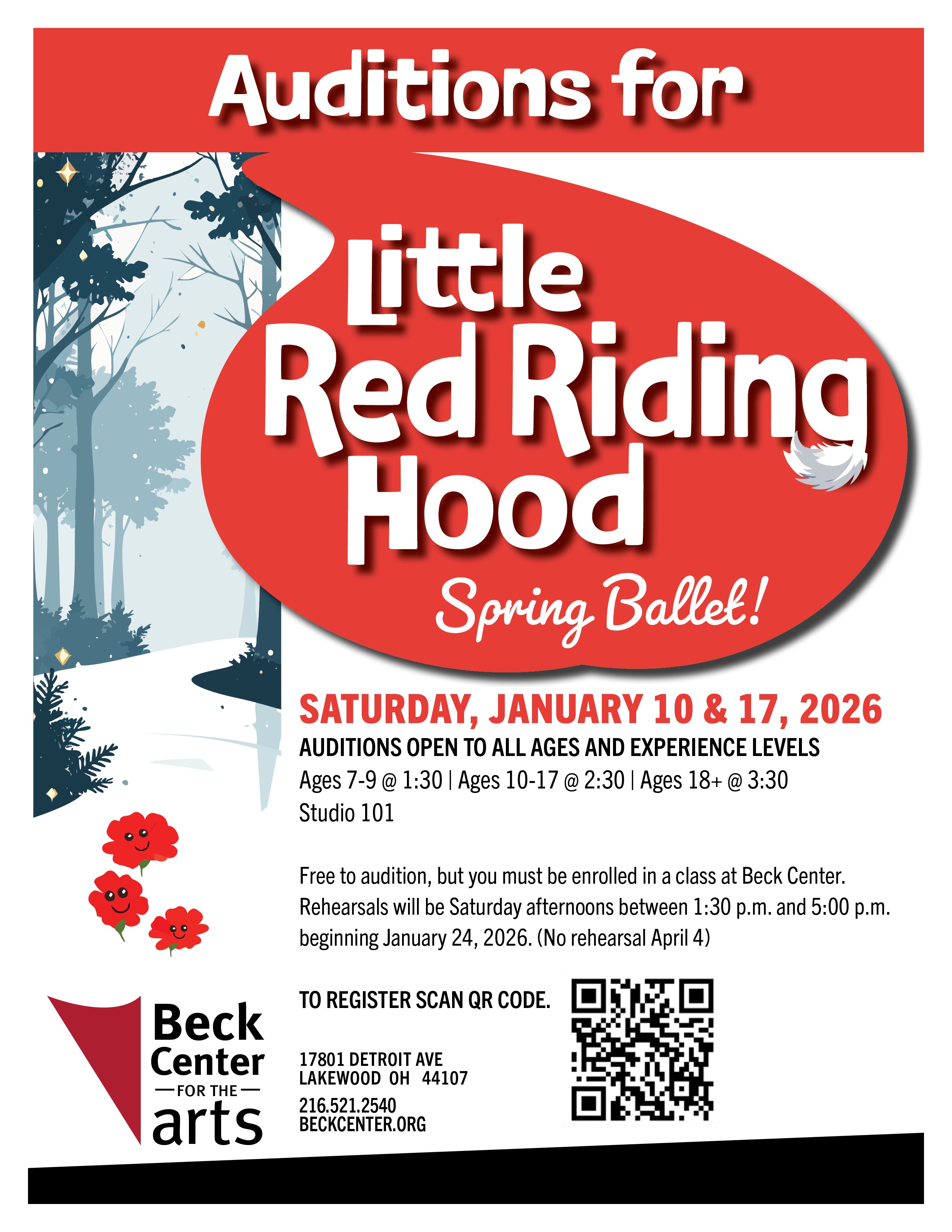 Free to audition, but you must be enrolled in a class at Beck Center. Rehearsals will be Saturday afternoons between 1:30 and 5 beginning Jan. 24, 2026. (No rehearsal Apr. 4)