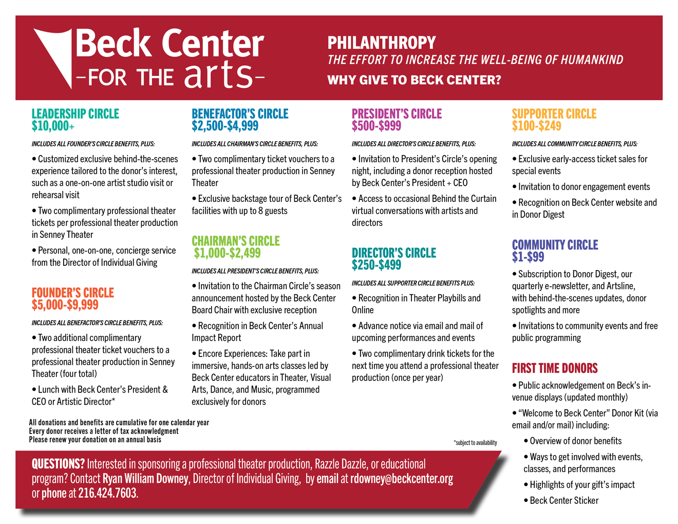 Annual Fund gifts to Beck Center for the Arts provide vital operating support to the areas of greatest need. With your donation, you are making an investment that impacts Beck Center in countless ways. Gifts to the Annual Fund provide Beck Center important unrestricted operating support for our programs, exhibitions, scholarships, student financial aid, and overall upkeep of the facility. Please consider joining the many in supporting the arts in our community by making a tax-deductible gift today!